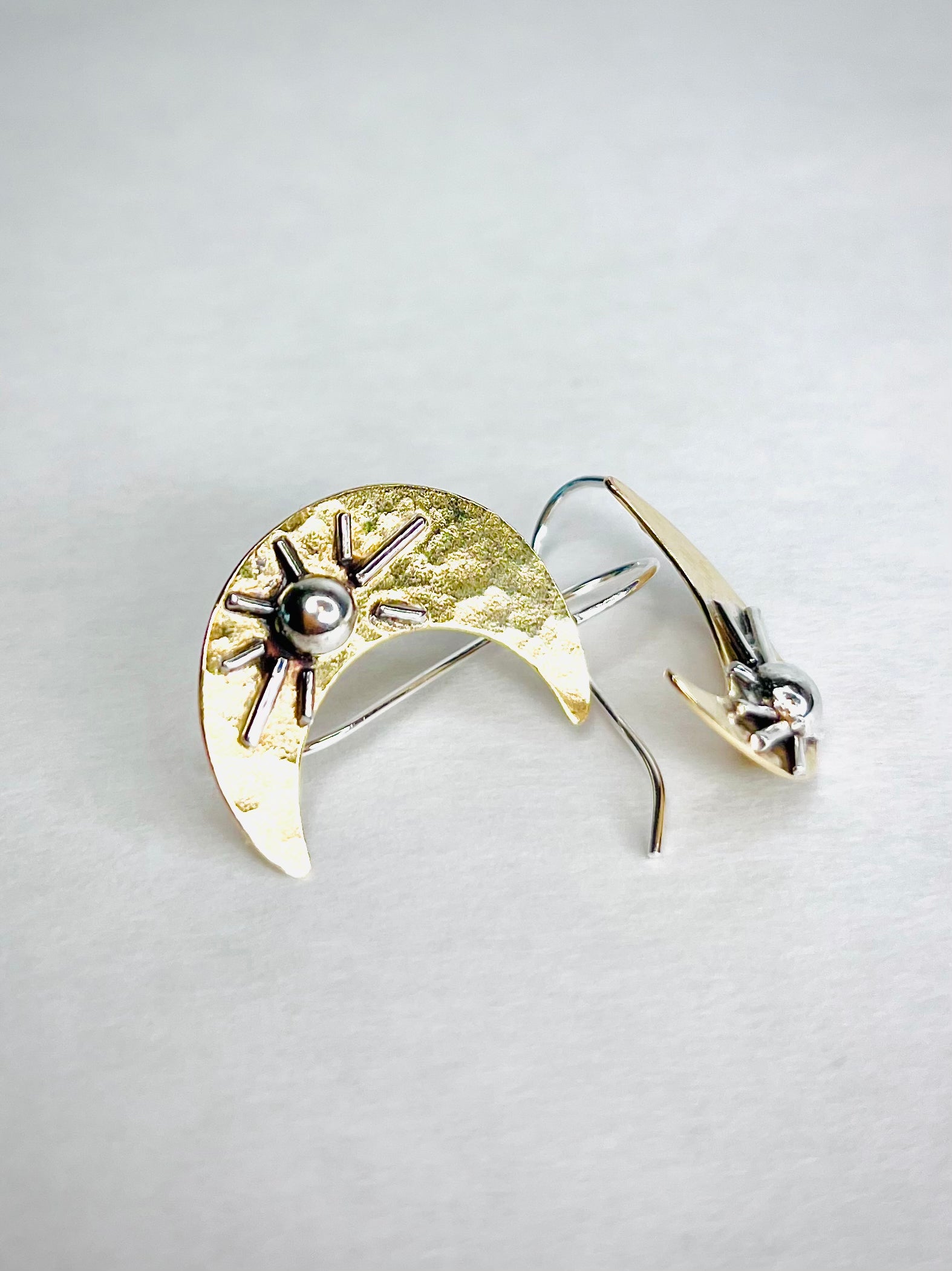 **Handcrafted earring made with brass metal sheet and sterling silver (925) metal wire. Moon has been hammered for a beautiful and stunning look, SUN made with melted sterling silver ball and wire.