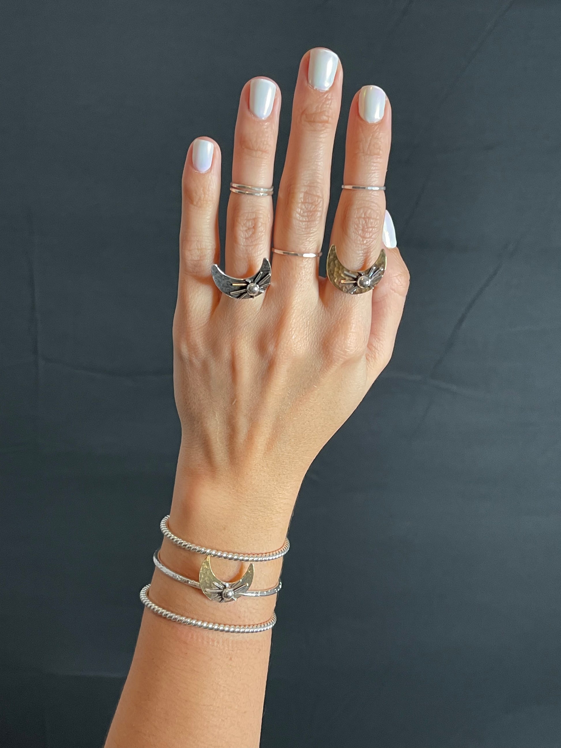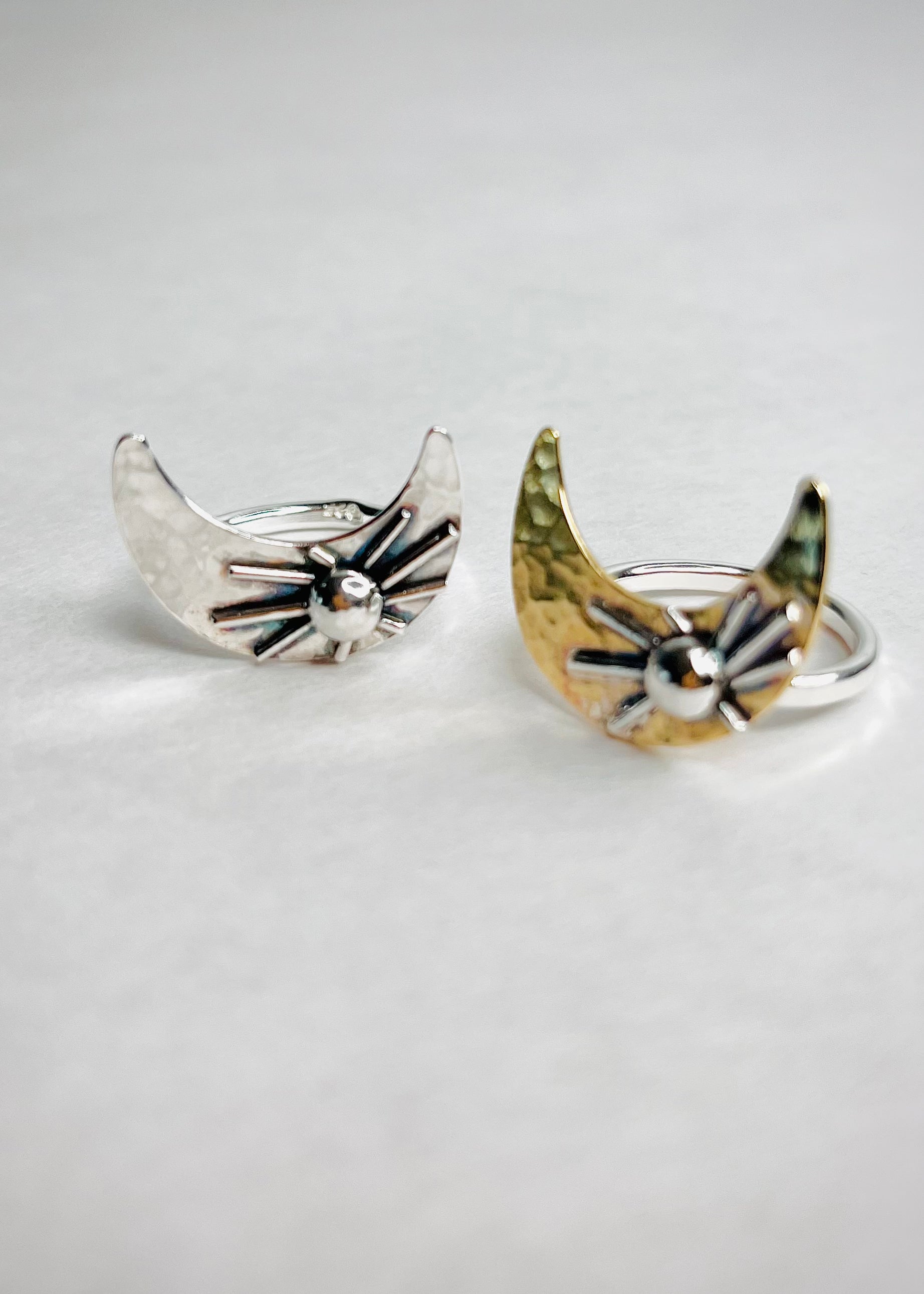 **Handcrafted ring made with sterling silver 925 metal. Moon made with brass metal sheet. Moon has been hammered for a beautiful and stunning look, SUN made with melted sterling silver ball and wire.