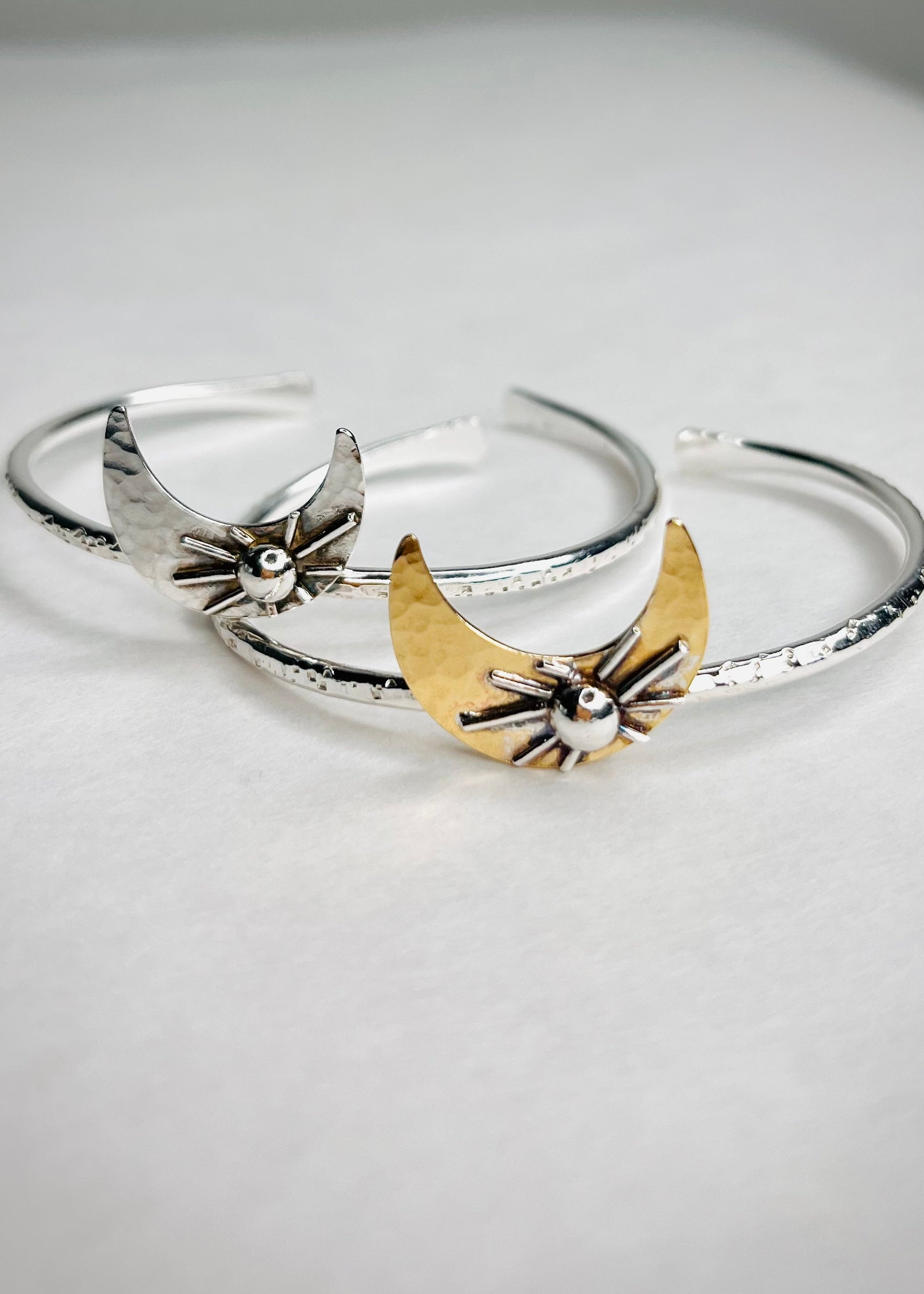 **Handcrafted cuff made with brass and sterling silver 925 metal. Moon has been hammered for a beautiful and stunning look, SUN made with melted sterling silver ball and wire.