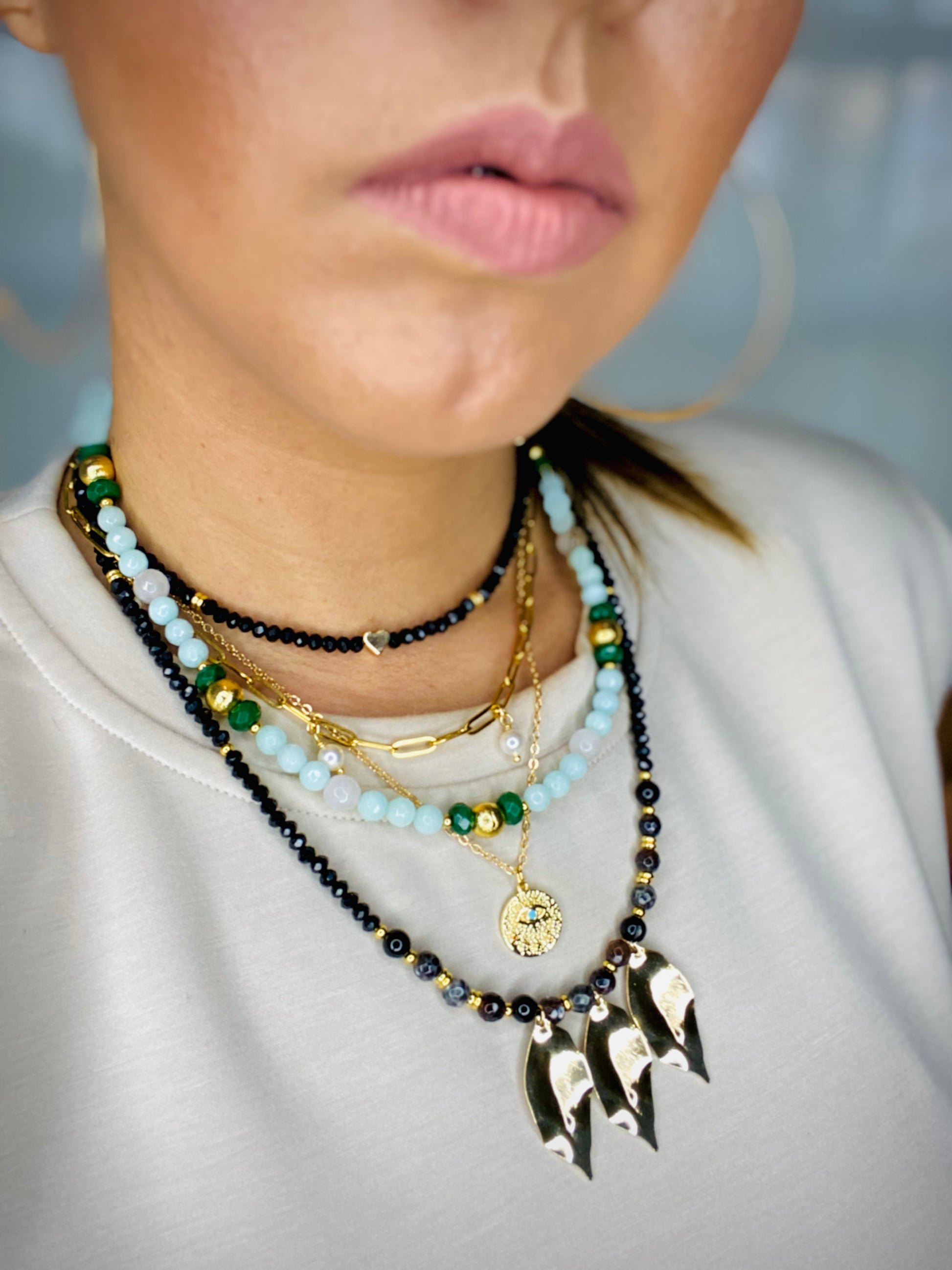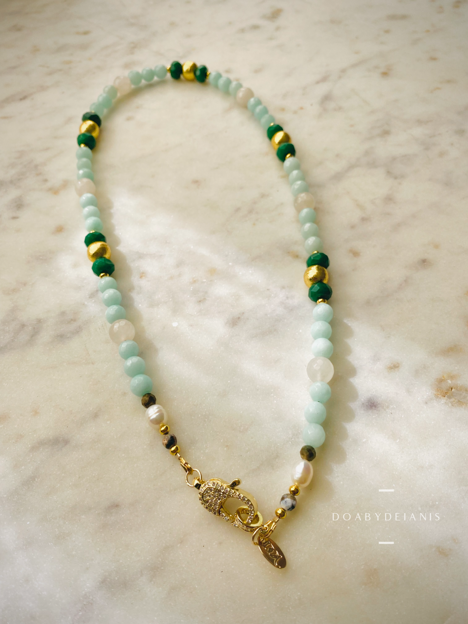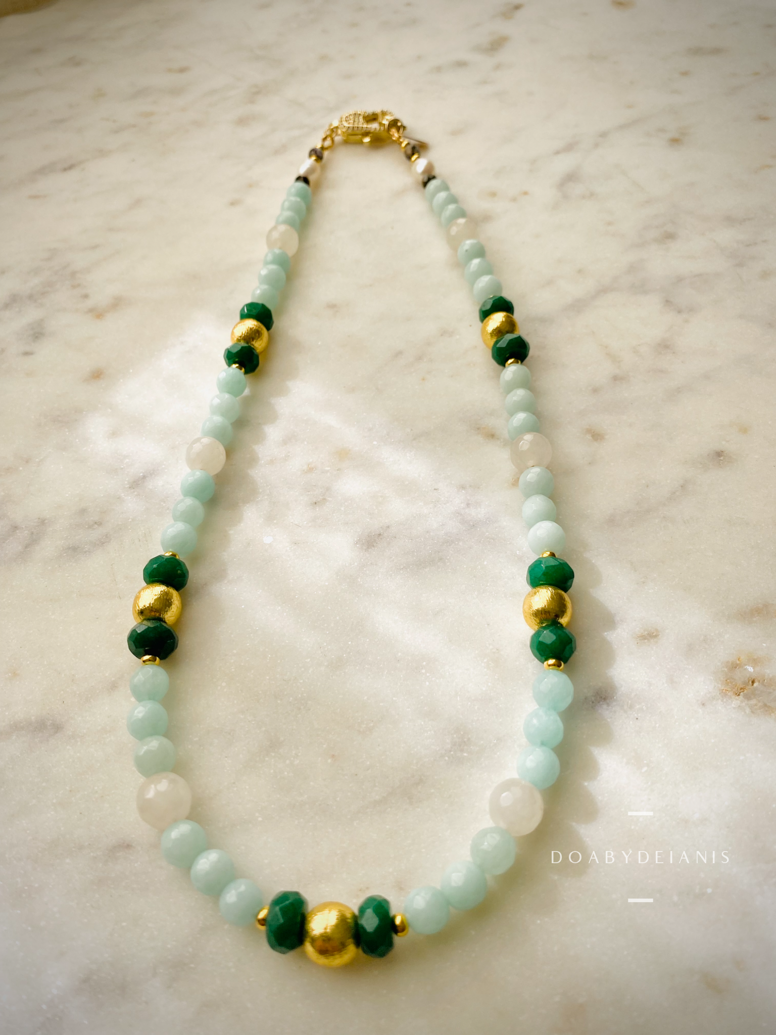 This beautiful necklace can be your center piece to combine with other necklaces (Solo Chains or even other gemstone necklaces). I want to create this delicate piece with the harmony of the sea and the beautiful green mountain as I see every day on my Island.