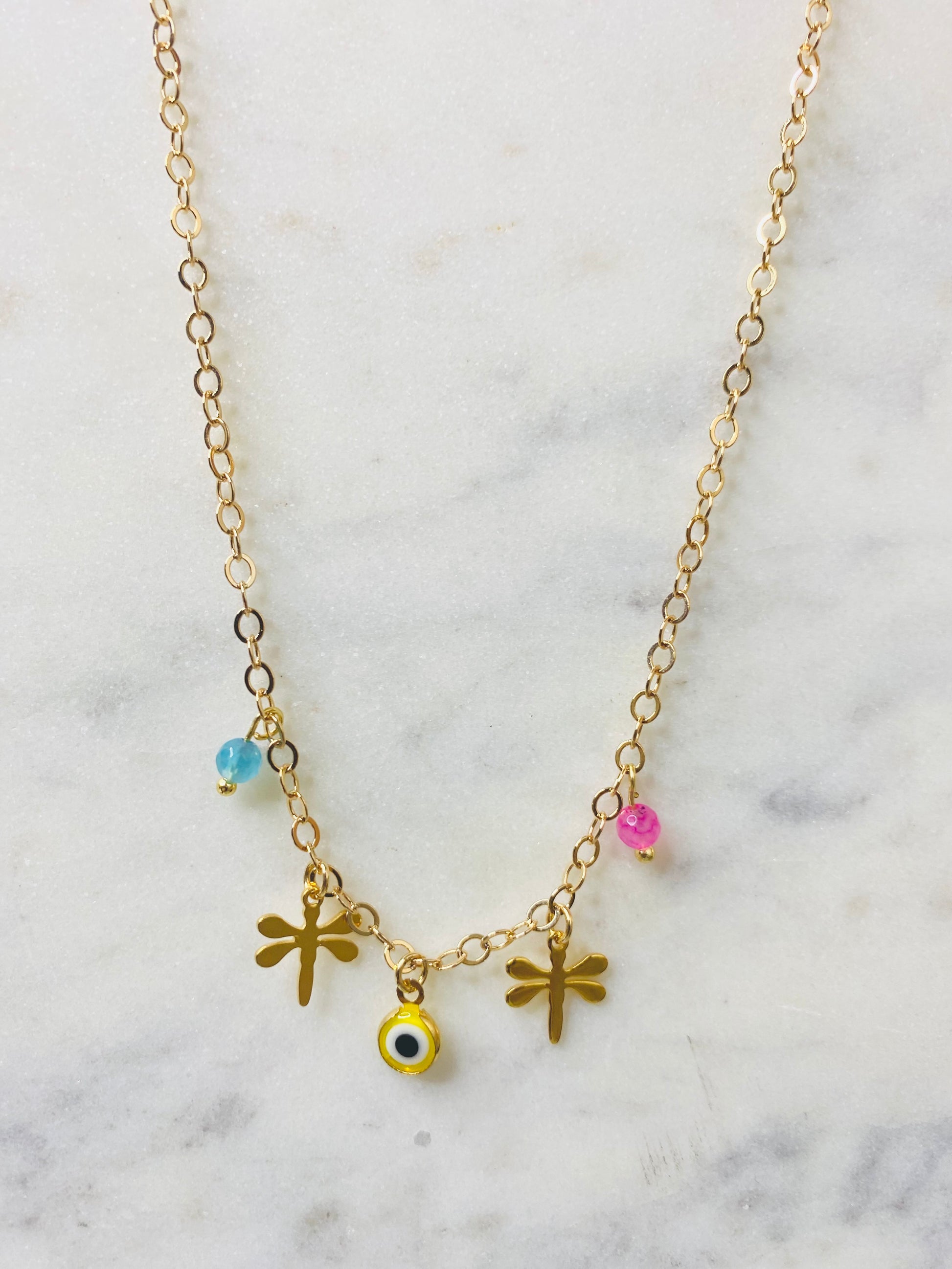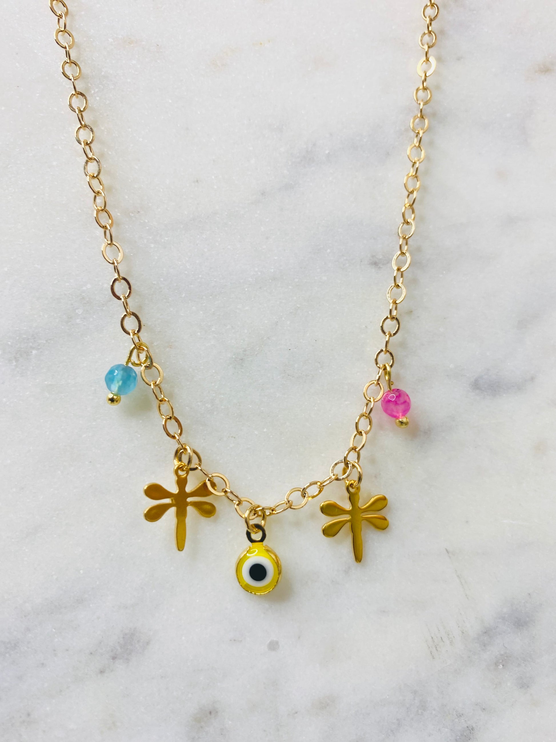 ** Dragonfly charms, evil eye charm and crystals. Necklace long is 18 inches. Piece in 18k real gold plated (enchapado en oro).