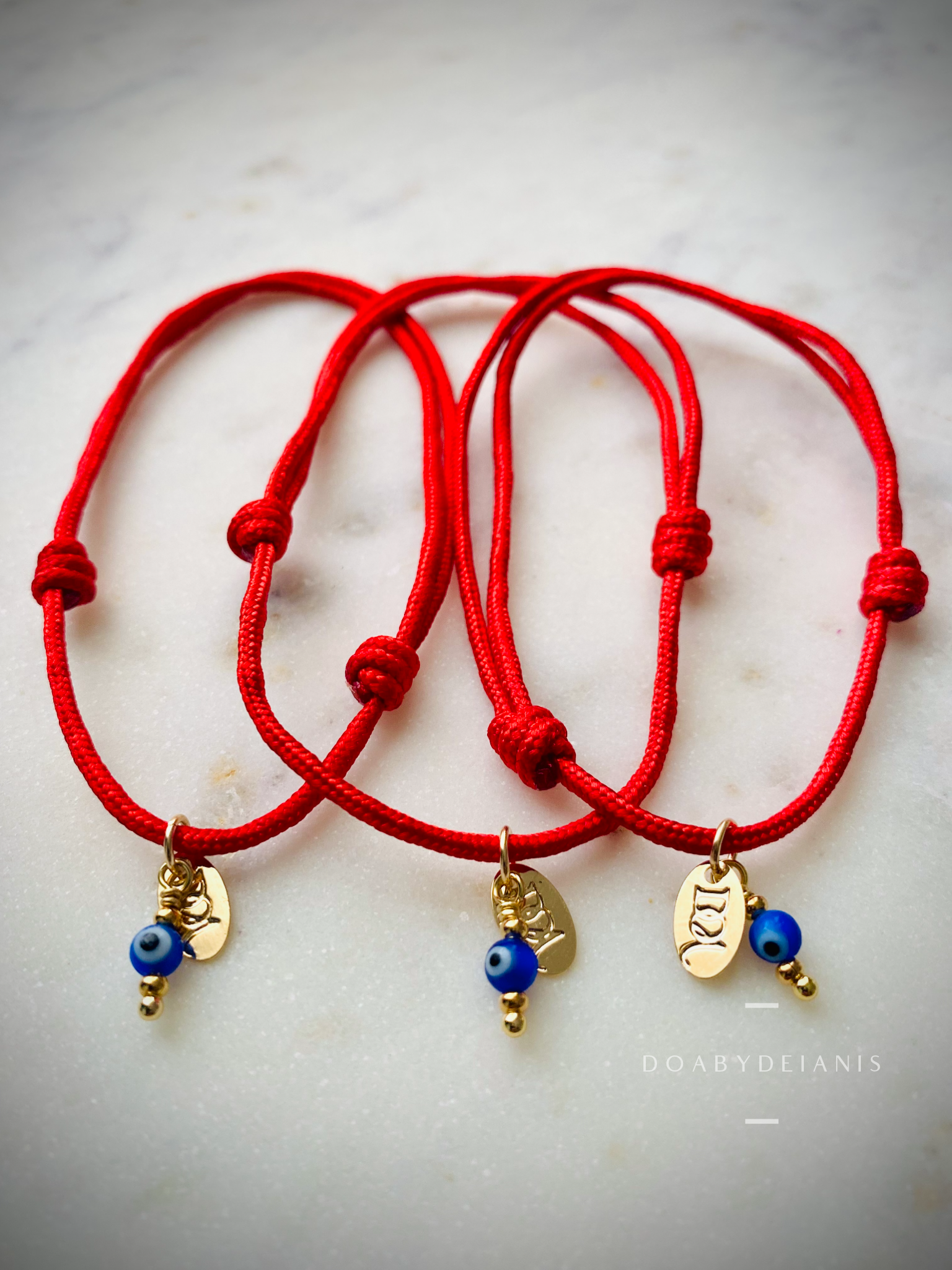 ** (Price is for 1 bracelet) - Pulsera con hilo de nylon con dos nudos franciscanos. Pulsera ajustable. DOA brand tag y un ojo turco "evil eye" símbolo de protección. Materiales dorados en 18k real gold plated (enchapado en oro).