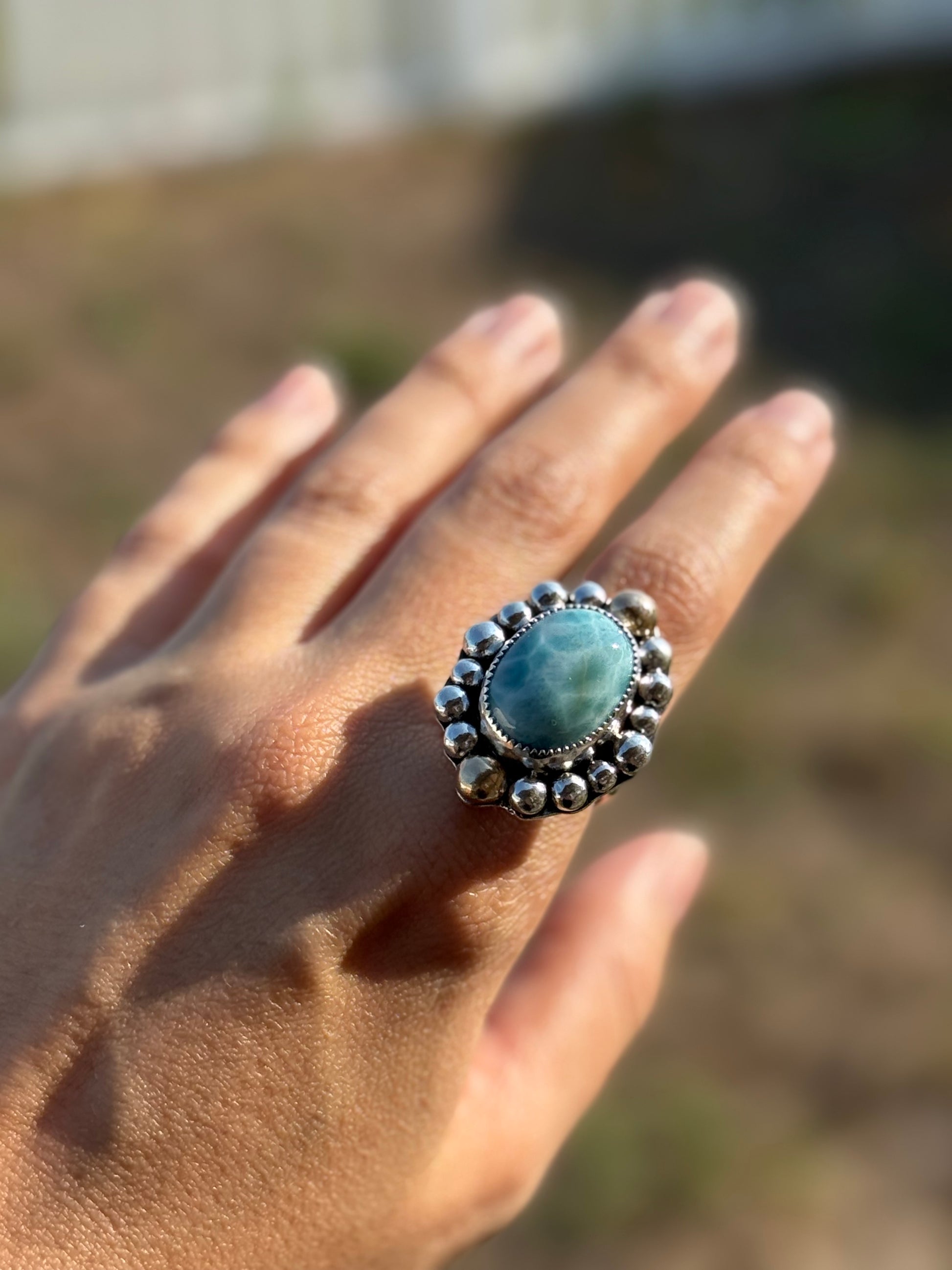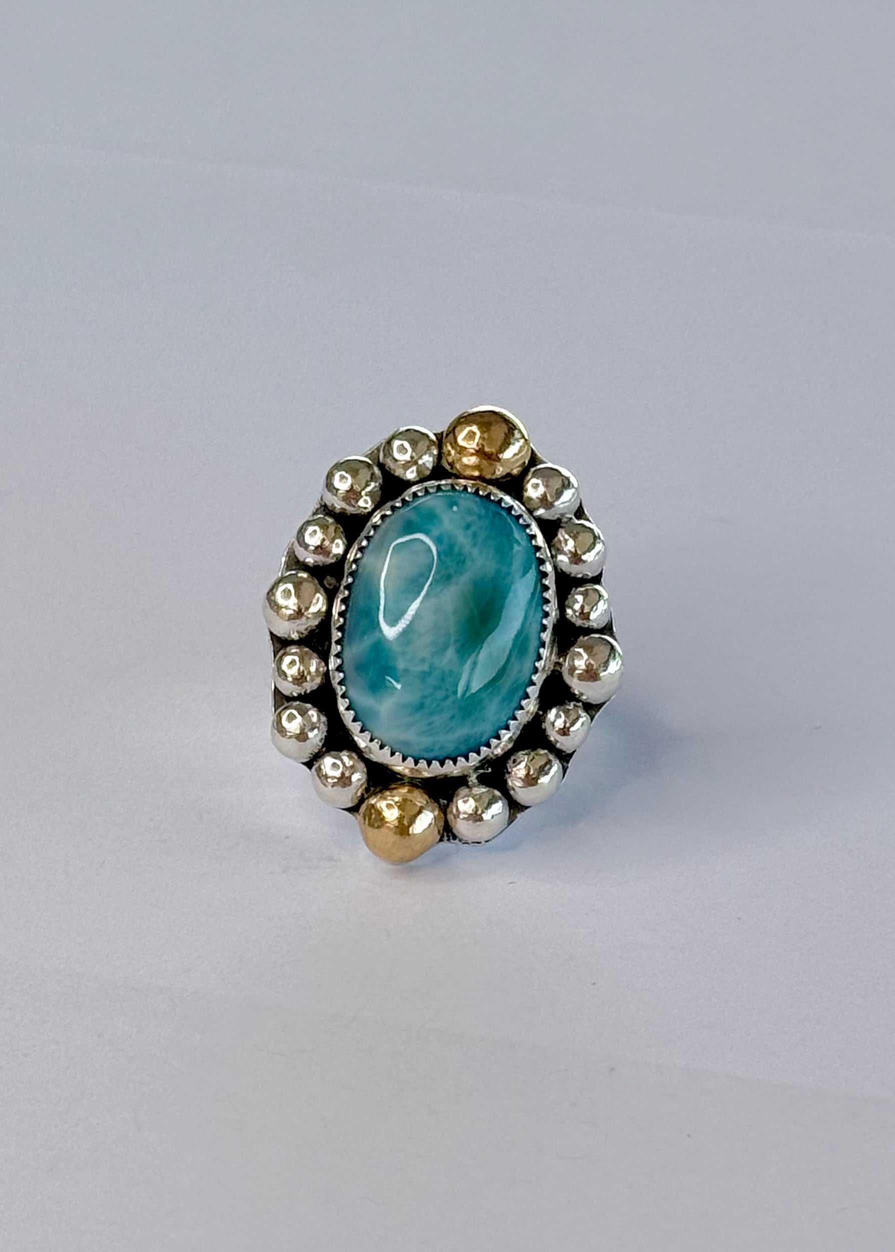 Gorgeoussssss Larimar with hand stamped band and a unique circule of metal balls as a magnificent crown around the stone.