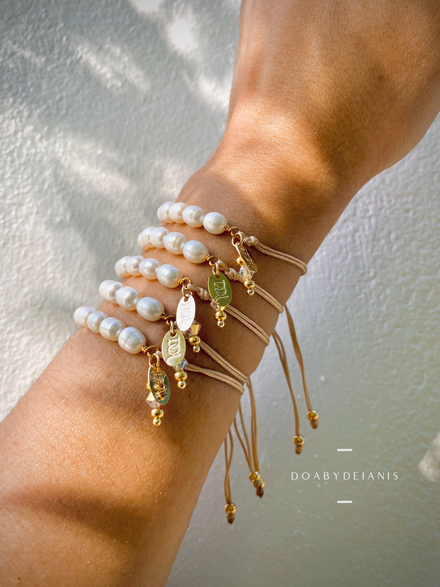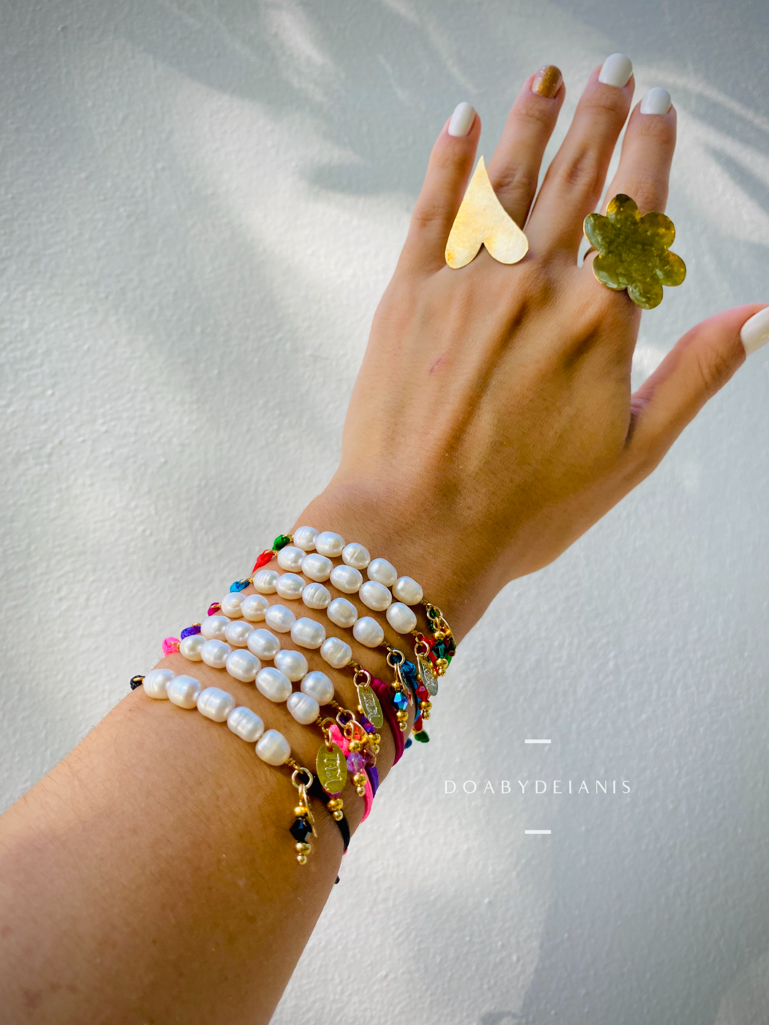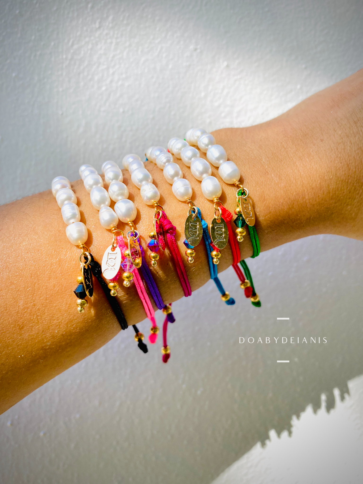 **Bracelet with fresh water pearls on wire. Available on diferentes cord colors. Beautiful color to combine with any outfit. Bracelet made with nylon cord and 24k gold plated 24k findings. Pieces have a little touch with a beautiful Swarovski bicone crystal in combination.