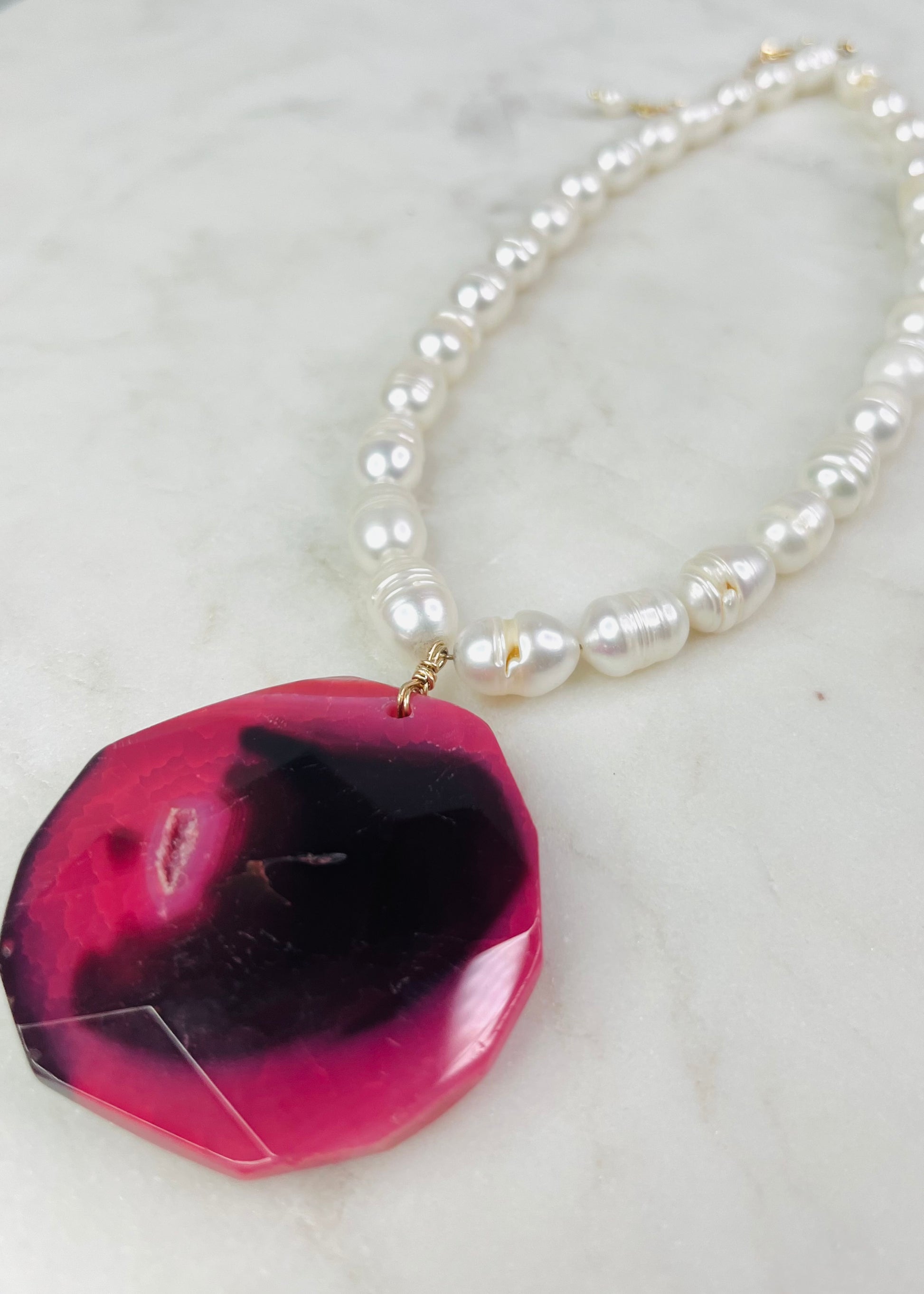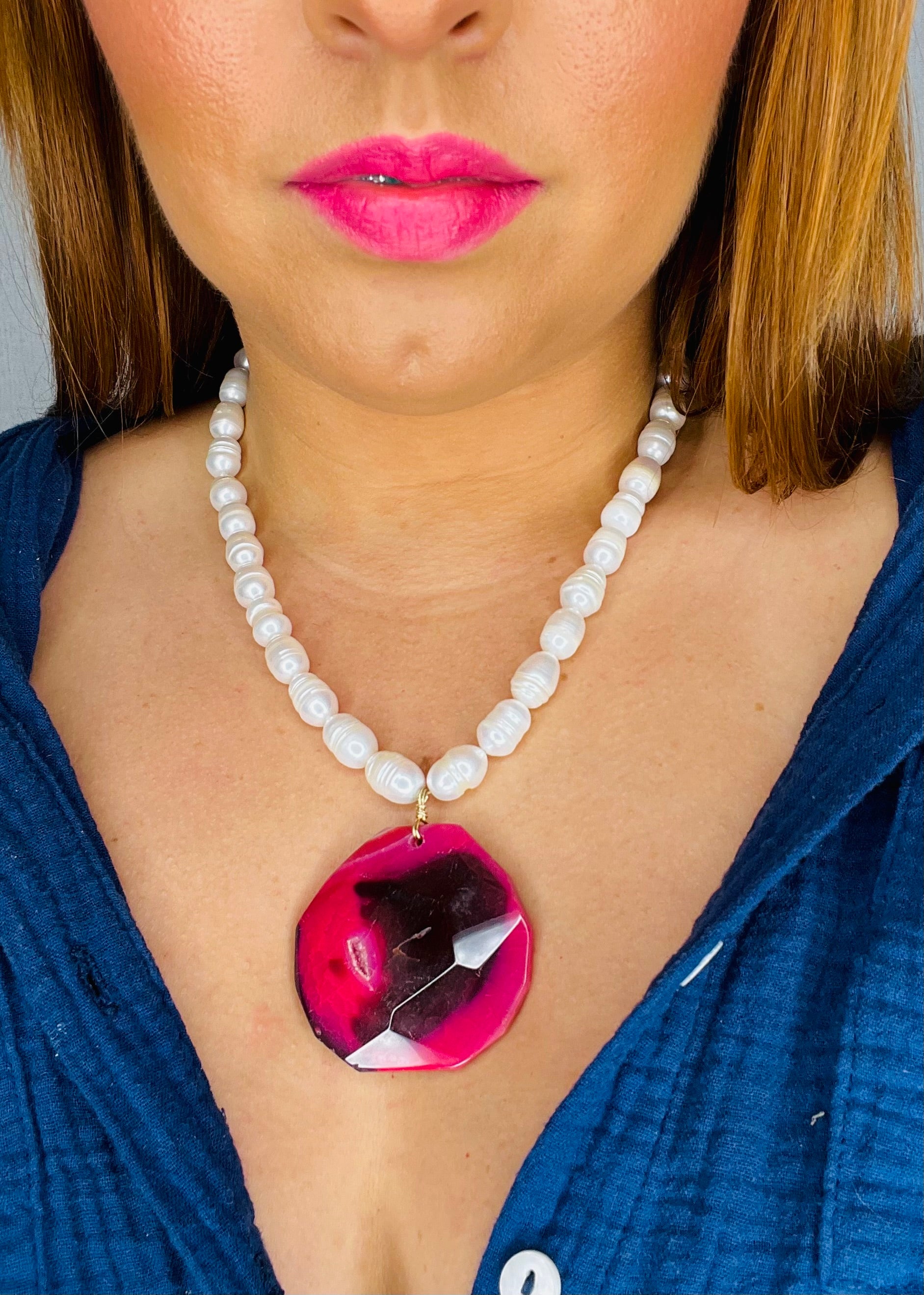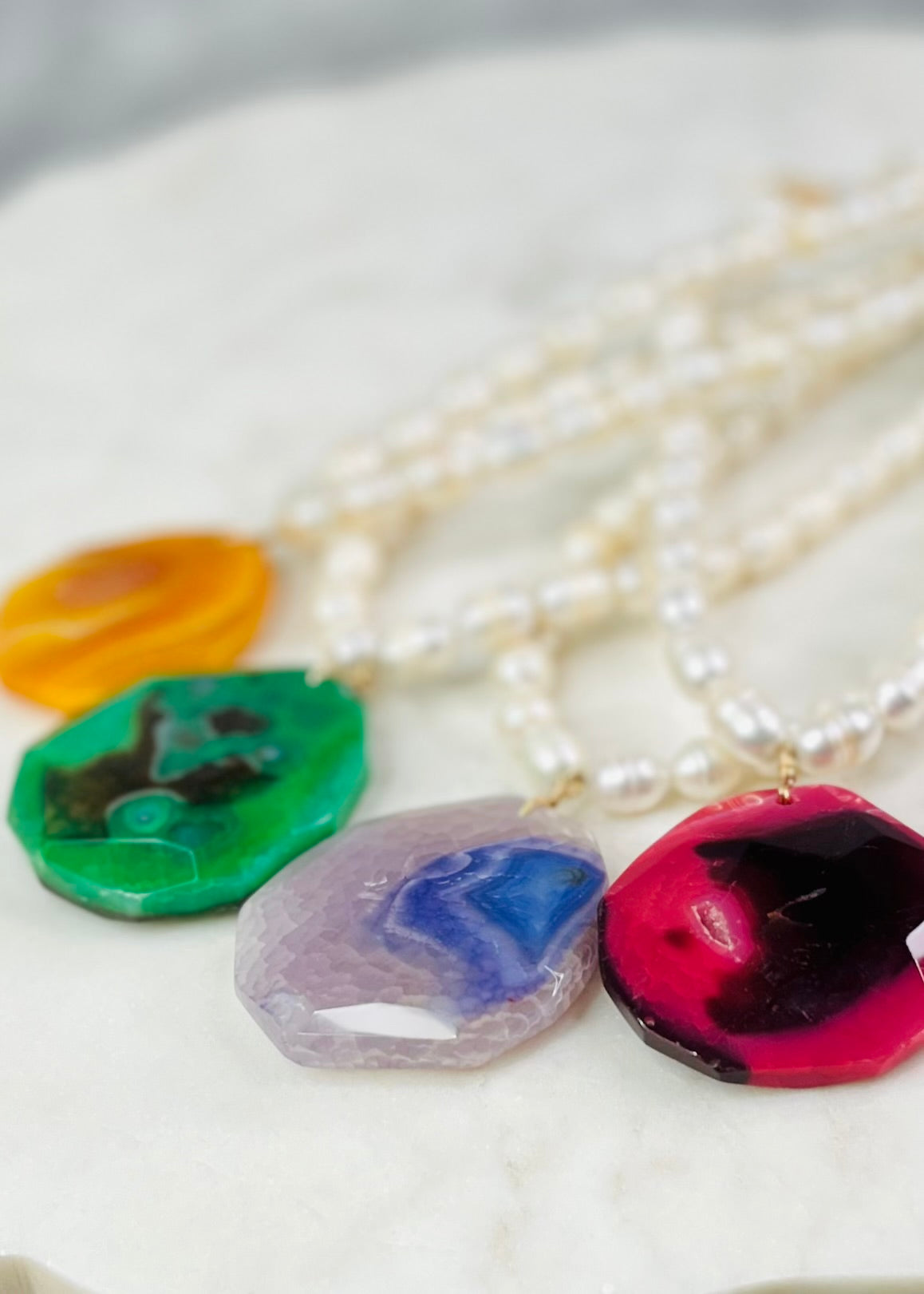 Experience balance and elegance with our Necklace Agata. Crafted with agate stone for stability and embellished with vibrant pearls, this unique piece is the perfect addition to your summer wardrobe. Make a statement with this colorful and stunning necklace. Upgrade your look with this one-of-a-kind necklace.