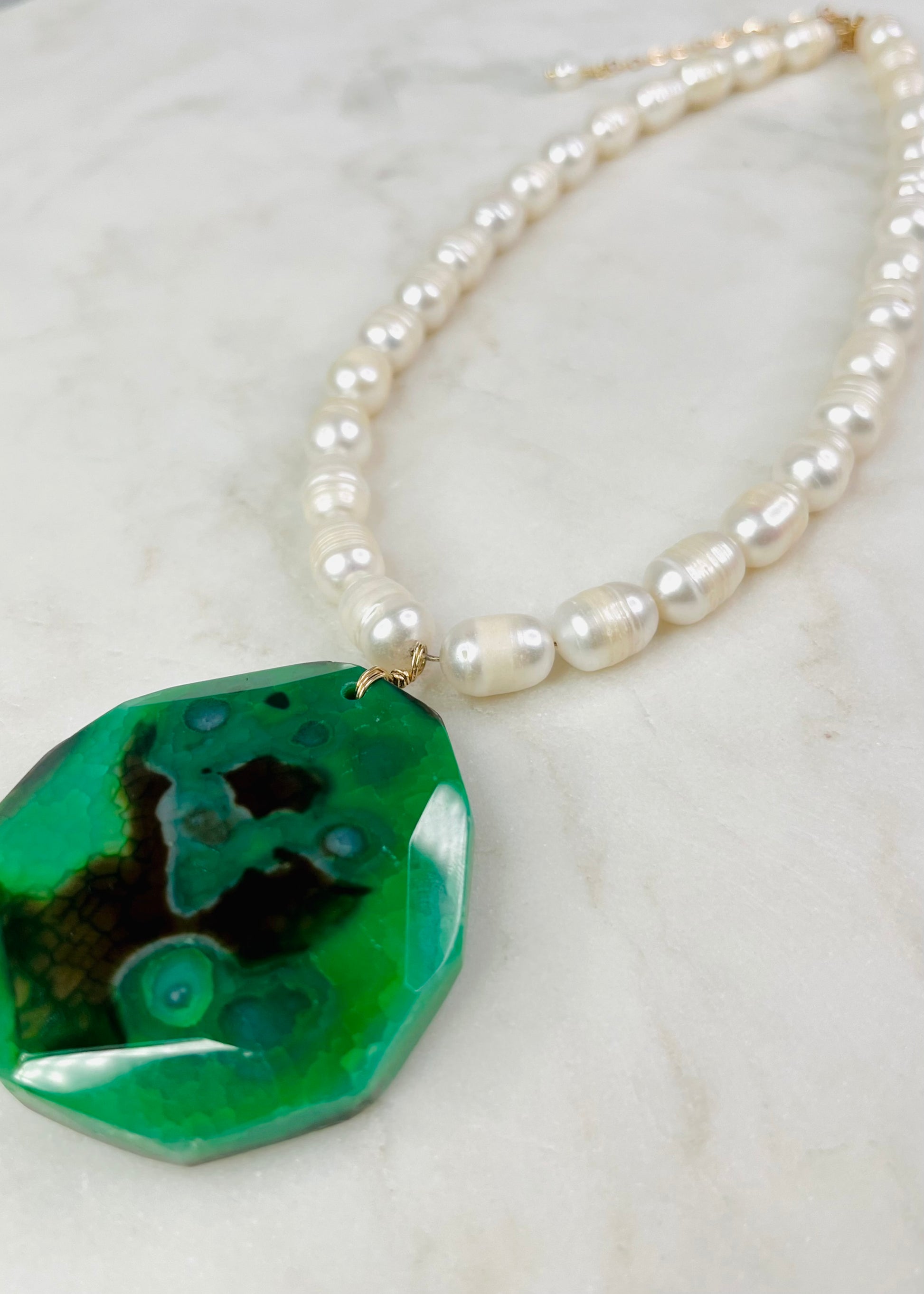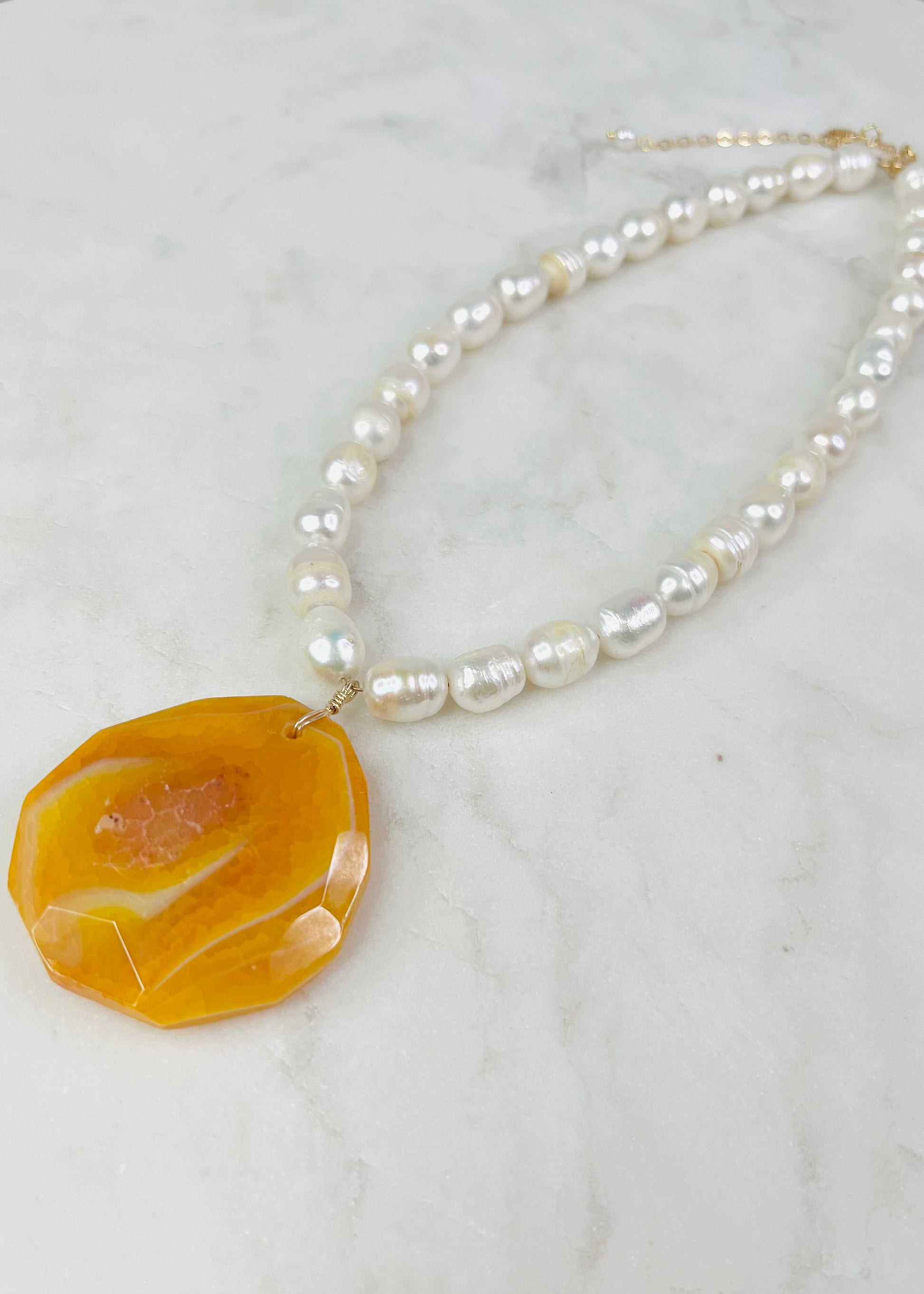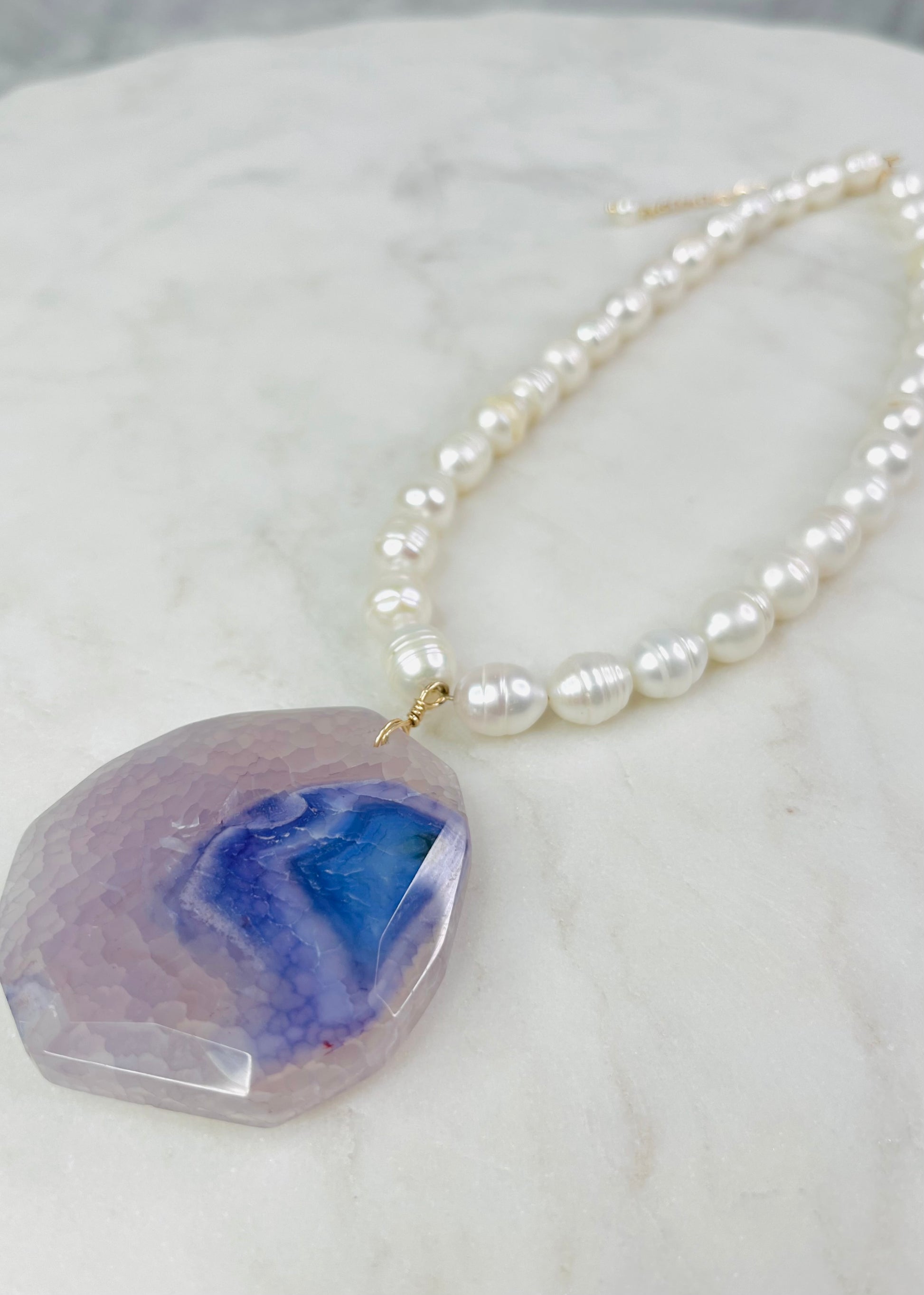Experience balance and elegance with our Necklace Agata. Crafted with agate stone for stability and embellished with vibrant pearls, this unique piece is the perfect addition to your summer wardrobe. Make a statement with this colorful and stunning necklace. Upgrade your look with this one-of-a-kind necklace.