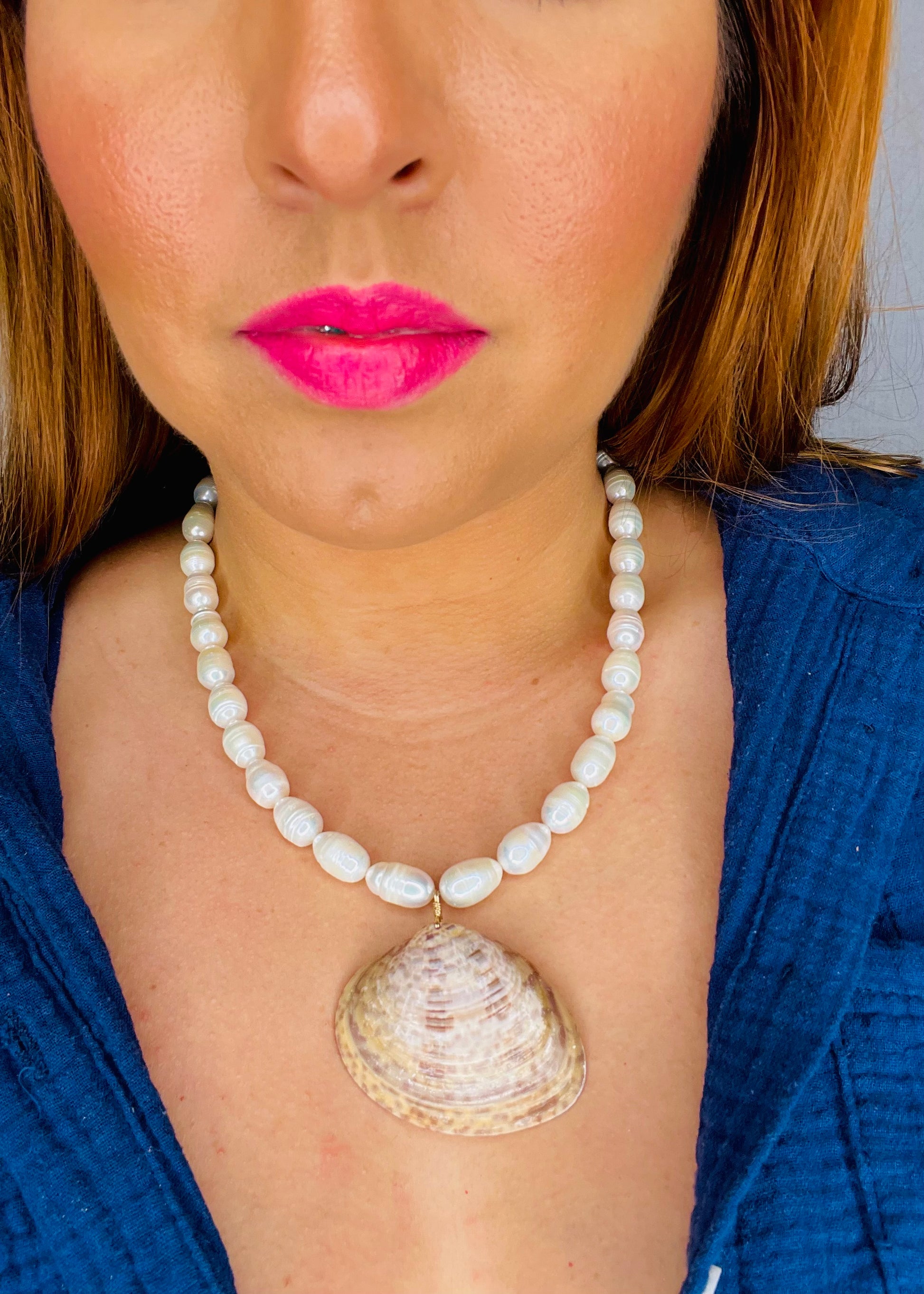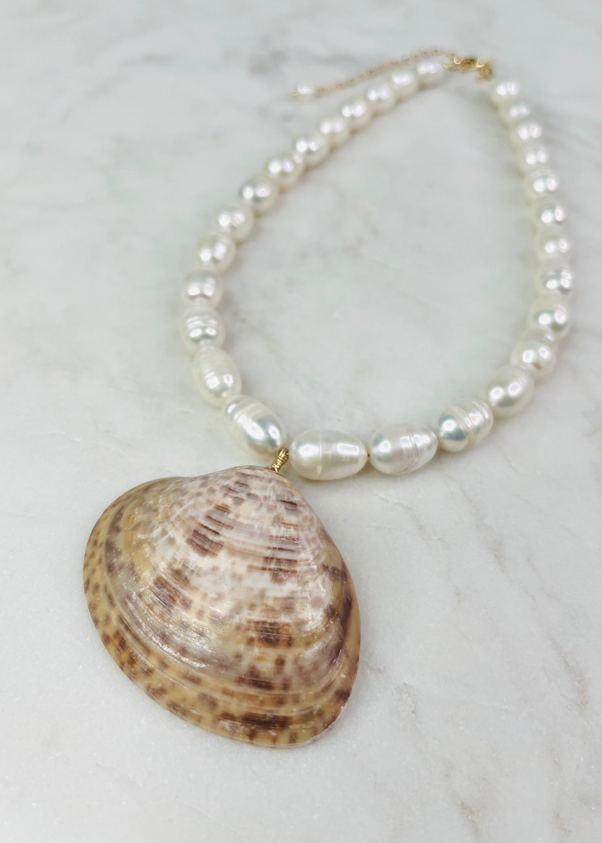 This elegant statement necklace features stunning caracol shell and delicate pearls, making it the perfect accessory for any summer event. With its unique combination of natural materials, this necklace is sure to make a stylish and sophisticated statement. Elevate your look with this must-have piece.