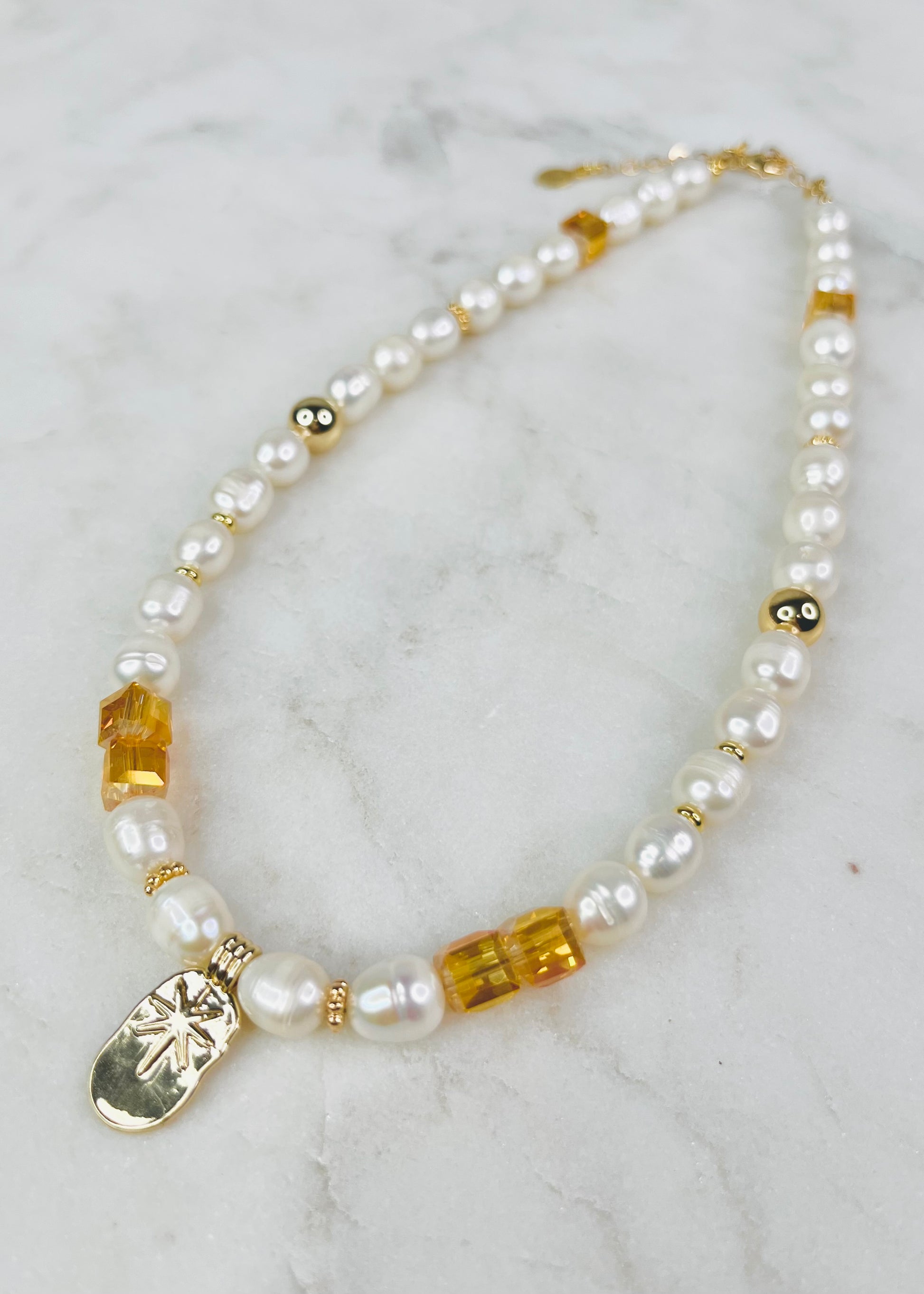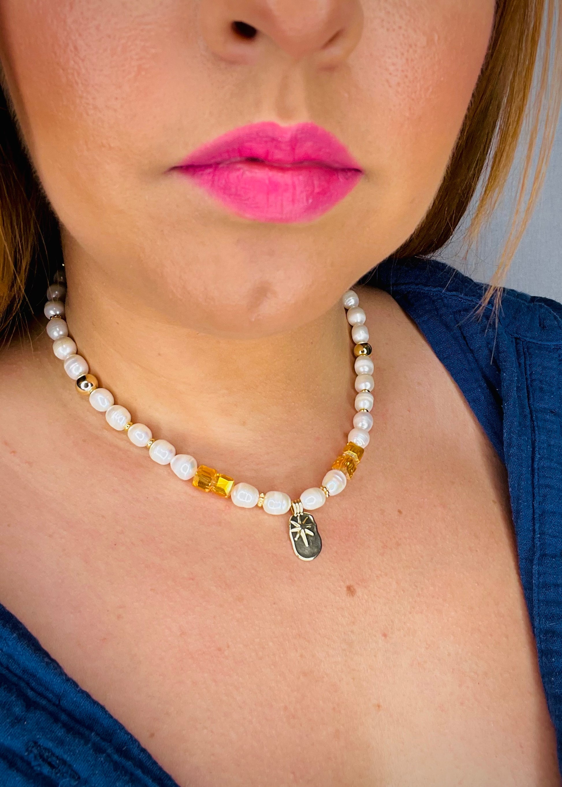 Discover a touch of sophistication with the Perla Del Mar Necklace. Featuring exquisite pearls and a classic design, this refined accessory elevates any outfit. Perfect for a seaside brunch or a formal occasion, this essential piece makes a statement with its timeless elegance.