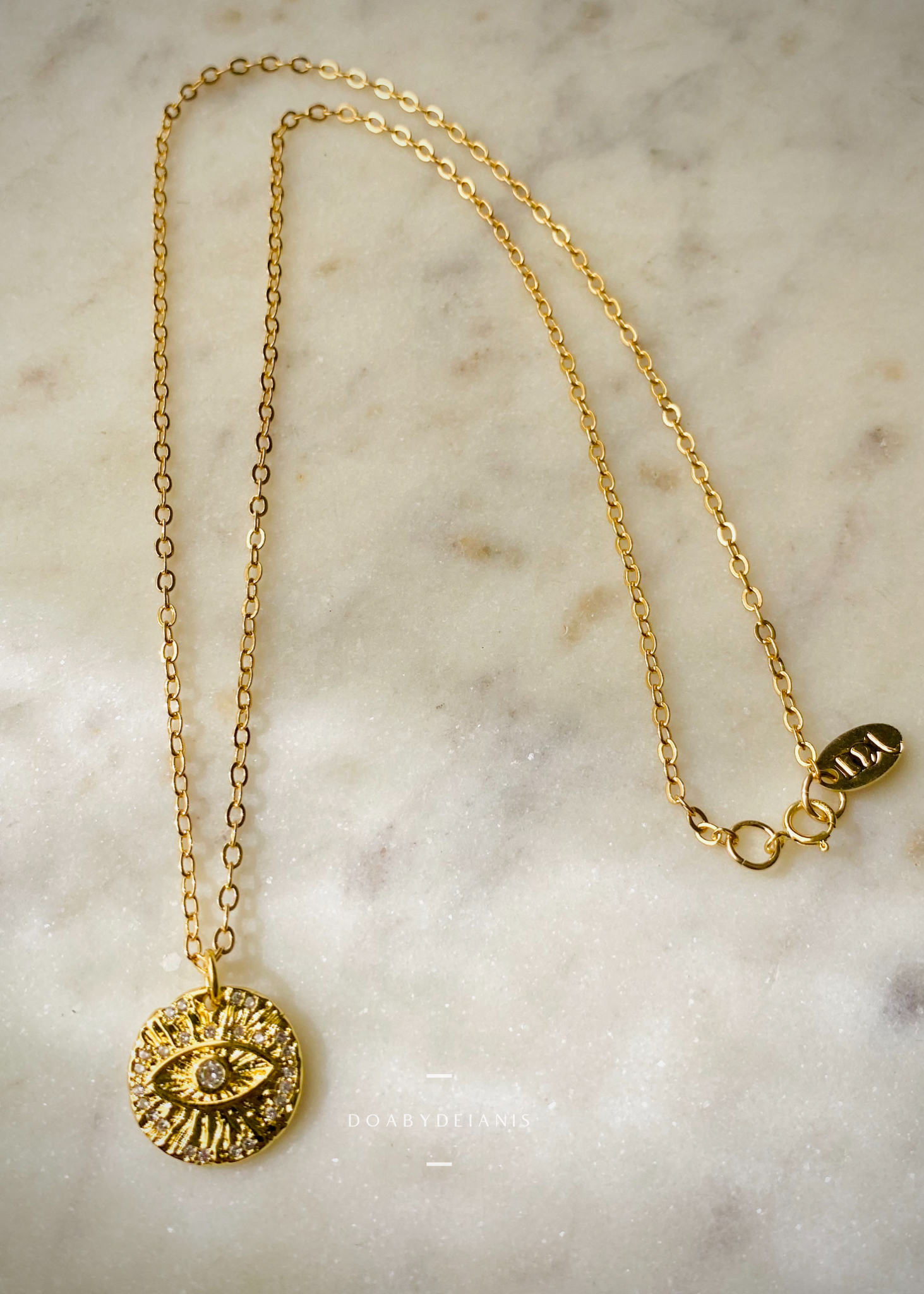 **Minimalist necklace with an Evil Eye Charm with rhinestones. Piece made with 18k real gold plated (enchapado en oro).