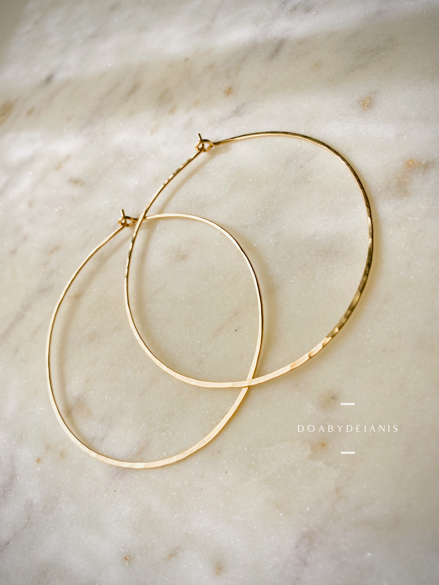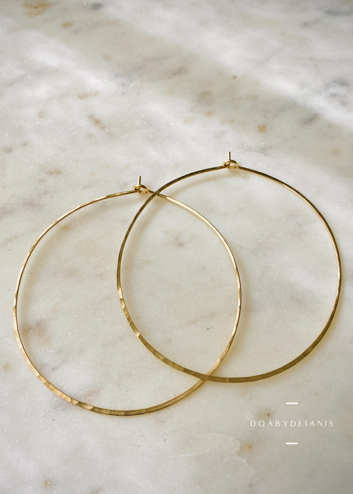 **Handcrafted earrings made with 14k gold filled metal wire. Round form with a delicate touch, piece has been hammered to give a little texture to the metal.