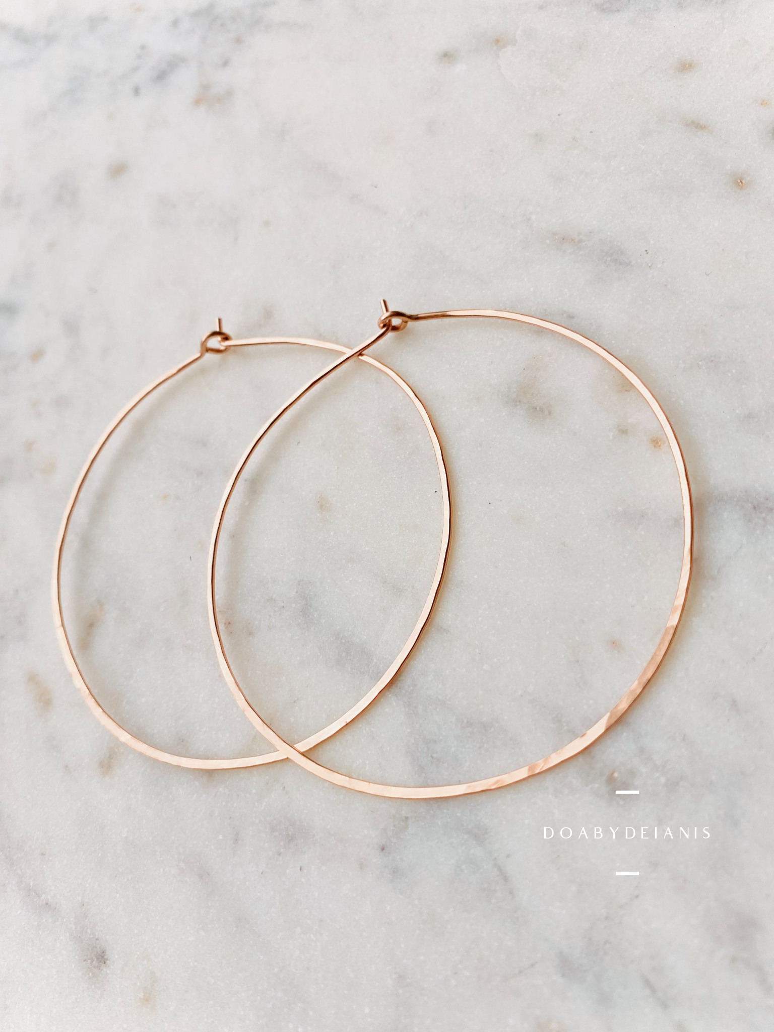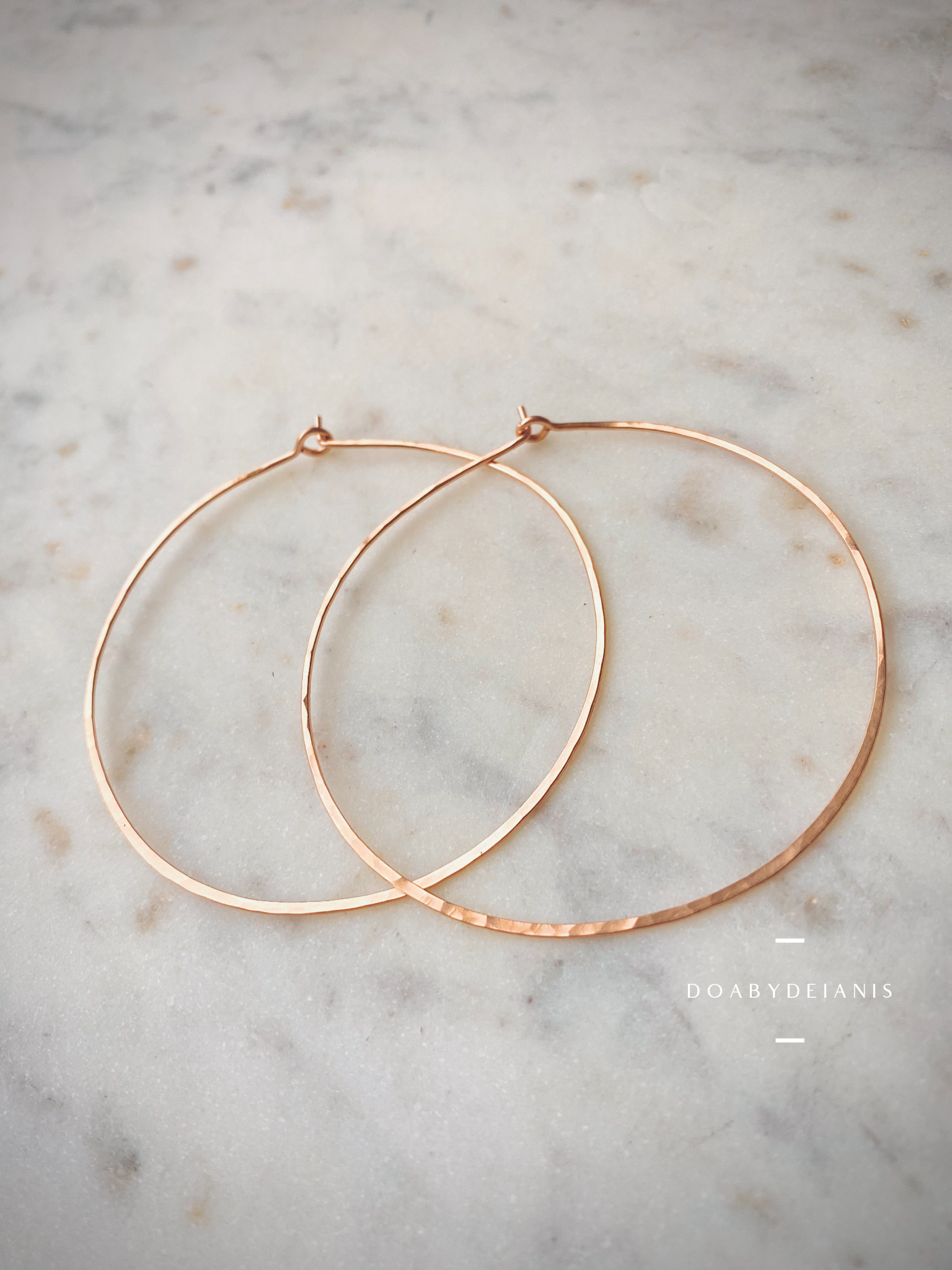 **Handcrafted earrings made with 14k rose gold filled metal wire. Round form with a delicate touch, piece has been hammered to give a little texture to the metal.