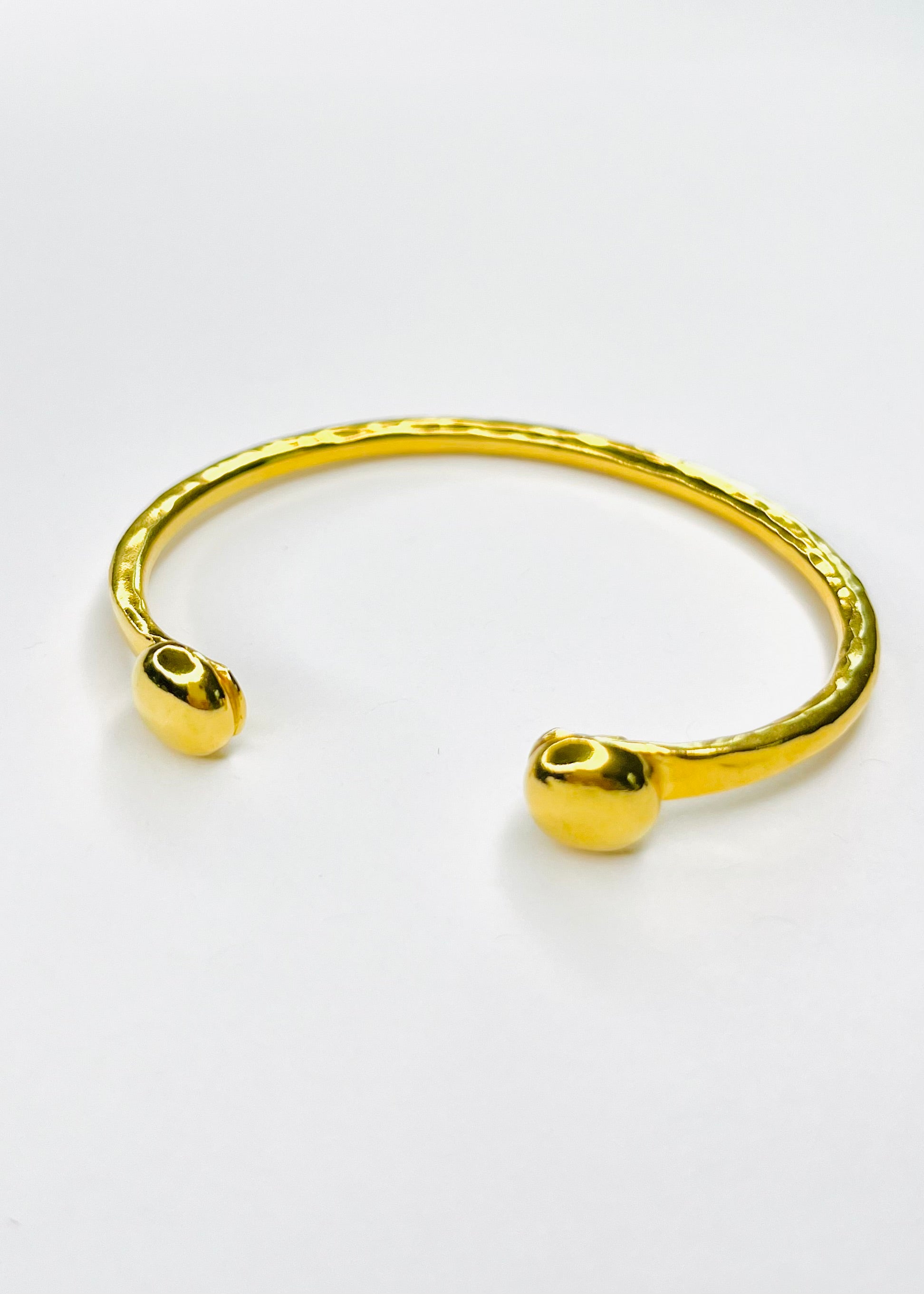 **Handcrafted cuff bracelet made with sterling silver metal wire. Piece has textured made with a hammer. Both points the piece has a sterling silver ball in representation of the beautiful FULL MOON. Pieces is Sterling silver metal cover with a layer of 18k real gold. What in the jewelry world we call a VERMEIL piece.